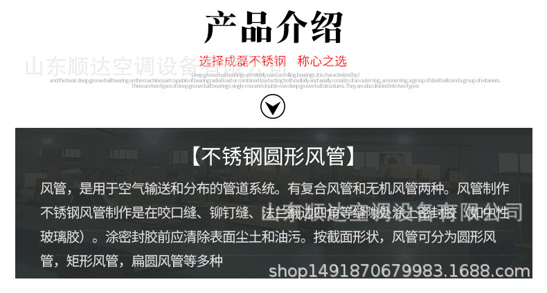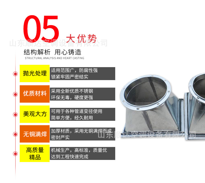 不銹鋼風管,不銹鋼風管可分為圓形和矩形兩種。可根據工程現場的不同要求,生產各種形狀、各種規格型號及板材的成品風管。不銹鋼風管主要材質有:SUS304、316、303、310、310S、301、302、304L、316L 、321、201、202、902、904、317、430等。不銹鋼風管表面性質主要有8K鏡面板、彩色不銹鋼板、不銹鋼磨砂板、不銹鋼拉絲板、不銹鋼花紋板、不銹鋼蝕刻板、鈦金、雪花砂、2B板、BA板和工業 [1] 中厚板。不銹鋼風管成品因其優異的耐蝕性、耐熱性、高強度等物化性能,主要應用于多種氣密性要求較高的工藝排氣系統、溶劑排氣系統、有機排氣系統、廢氣排氣系統及普通排氣系統室外部分、濕熱排氣系統、排煙除塵系統等。